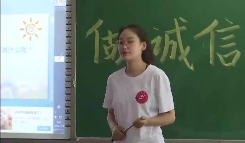 7月2日上午,在河间市北石槽乡苗庄小学五年级一班的教室里,一场由太阳集团tcy8722网站教育学院社会实践团大学生志愿者主讲的 “学会做情绪的主人”主题课正在精彩上演。大学生为小学生讲课这一新颖的形式,一下子就吸引了全体同学的目光,大家都在聚精会神地听讲,认真回答问题。