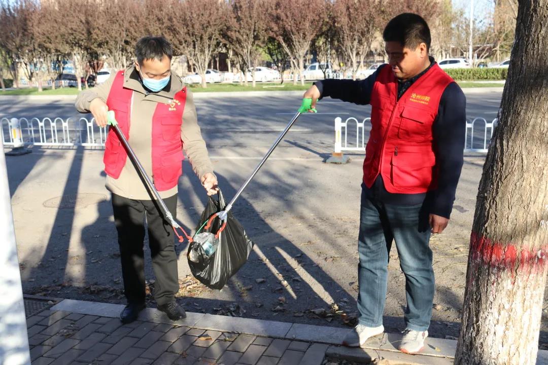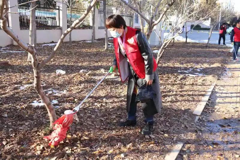 在活动过程中,志愿者们手持夹子和塑料袋对路面上和路边草地上的垃圾进行捡拾。由于大雪刚过,一些垃圾被卷到了路边清扫出的雪堆中,志愿者们踩着雪对雪堆中的垃圾进行清理。清扫过后,路面、草地和雪堆都都变得更加整洁干净。