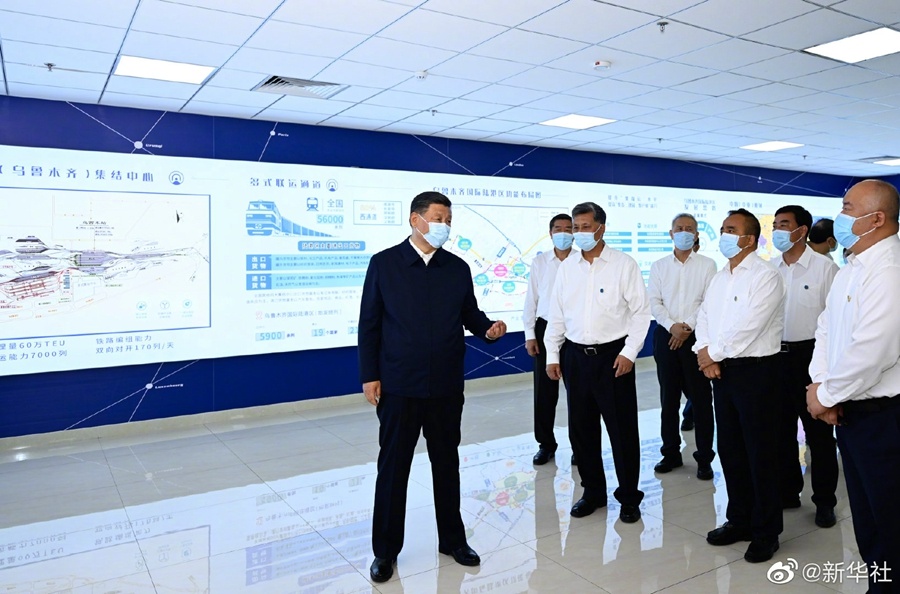 习近平总书记12日下午来到乌鲁木齐国际陆港区,听取整体情况介绍,通过实时画面察看中欧班列(乌鲁木齐)集结中心各功能区和阿拉山口口岸、霍尔果斯口岸现场作业情况,并同工作人员及现场办事人员亲切交流。习近平说,共建“一带一路”倡议提出这些年来,硕果累累。随着共建“一带一路”深入推进,新疆不再是边远地带,而是一个核心区、一个枢纽地带,你们做的是具有历史意义的事情,已经取得很好的成绩,再接再厉,前途光明。