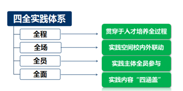 实施一条线贯穿培养全过程,在人才培养时间跨度上实现全程;校内外协调联动,在实践教学空间上实现全场;教育行政部门、高校、实践基地合作共育,在实践活动主体上实现全员;师德体验、教学实践、班级管理和教研实践全覆盖,在实践教学内容上实现全面。四全实践教学体系凝练出独具特色的育人品牌,有效促进了师范生综合素养的提升。