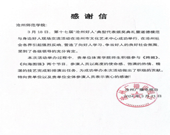 实训竞赛“强筋骨”:学院建有中国武术培训基地、全国围棋师资培训试点单位、国家武术段位培训及一级考核单位等实训平台;同时,学生在全国大学生武术套路锦标赛、全国大学生体育舞蹈、健美操锦标赛、河北省大学生运动会、河北省少数民族运动会等赛事活动中取得优异成绩,实现了专业技能水平的稳定提高。
