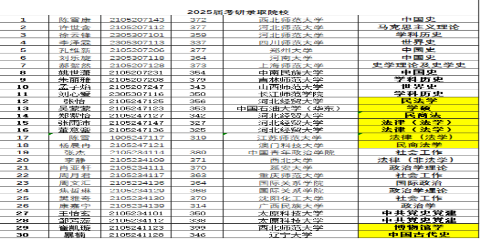 开展“魅力大一”专业导航,帮助新生明确奋斗目标规划发展路径,大二、大三开展法考培训、教资考试经验交流、考研经验分享,大四开展就业创业指导、考公考编经验分享,助力学生提升专业素养、坚定职业选择。2023届有45人通过国家研究生考试分数线,24人被录取;2024届有45人通过国家研究生考试分数线,26人被录取,毕业生3308学霸宿舍,5人顺利通过法考,2人考研成功,6人省考进面;2025届46人通过国家研究生考试分数线,31人被录取,特别是21级政行专业37名同学,录取10人。