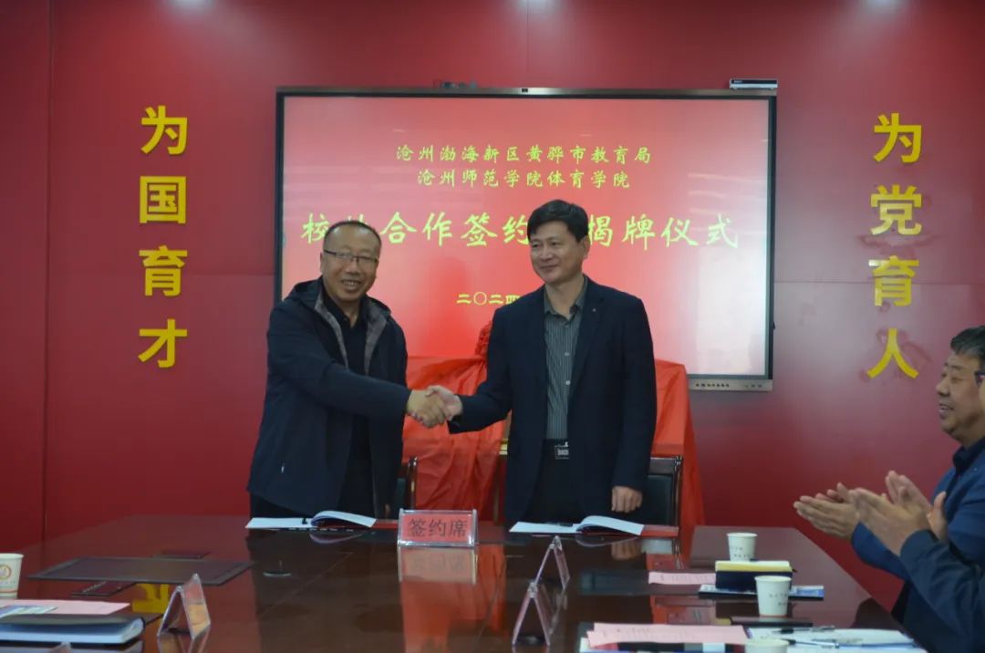 体育学院党总支书记孙宏超与渤海新区黄骅市教育局局长何寿彪签订合作共建协议